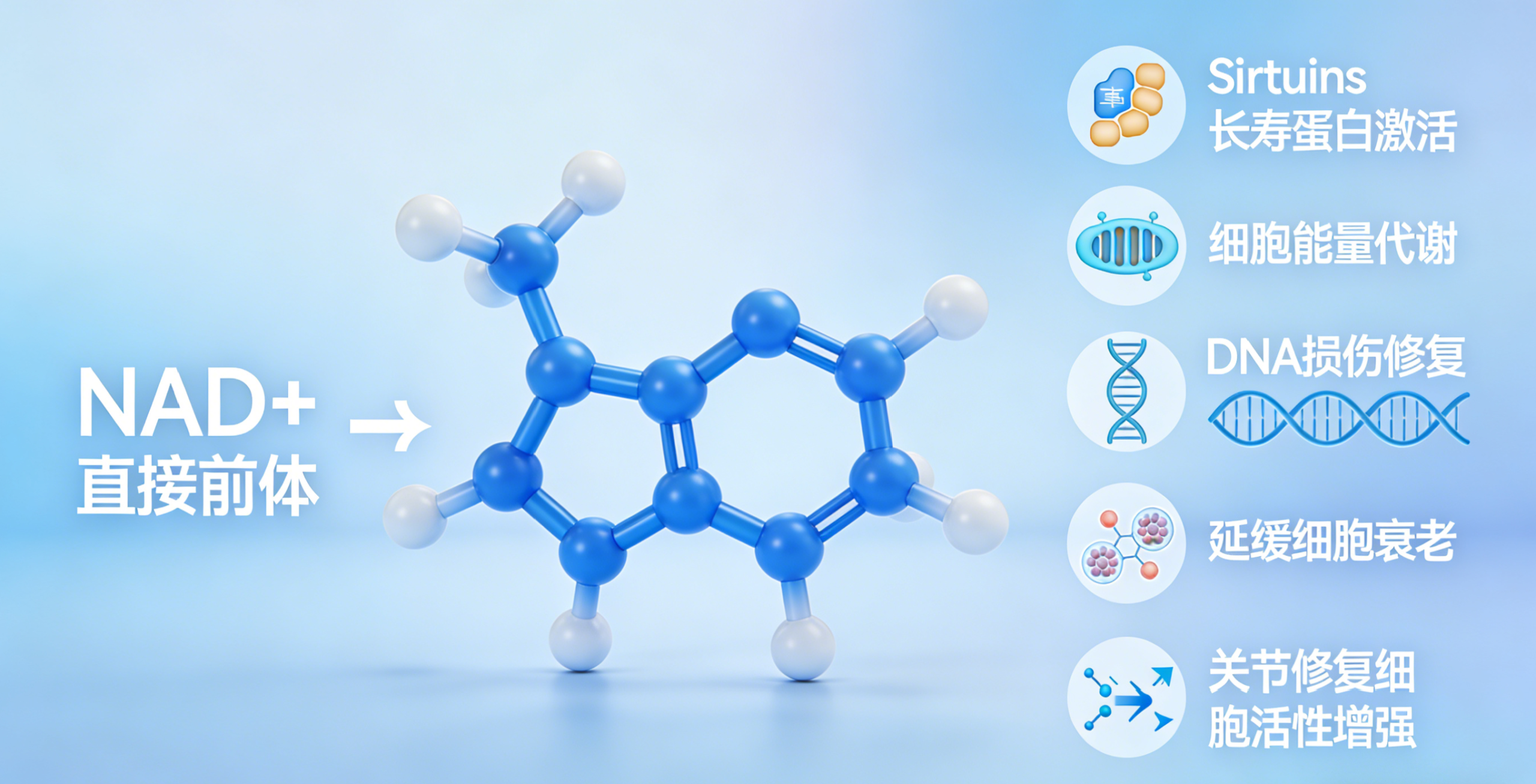 – Functions: As a direct precursor to NAD+, it rapidly increases NAD+ levels in the body, activates Sirtuins longevity proteins, promotes cellular energy metabolism, repairs DNA damage, and delays cell aging; it also helps improve bodily functions and enhances cellular activity for joint repair.