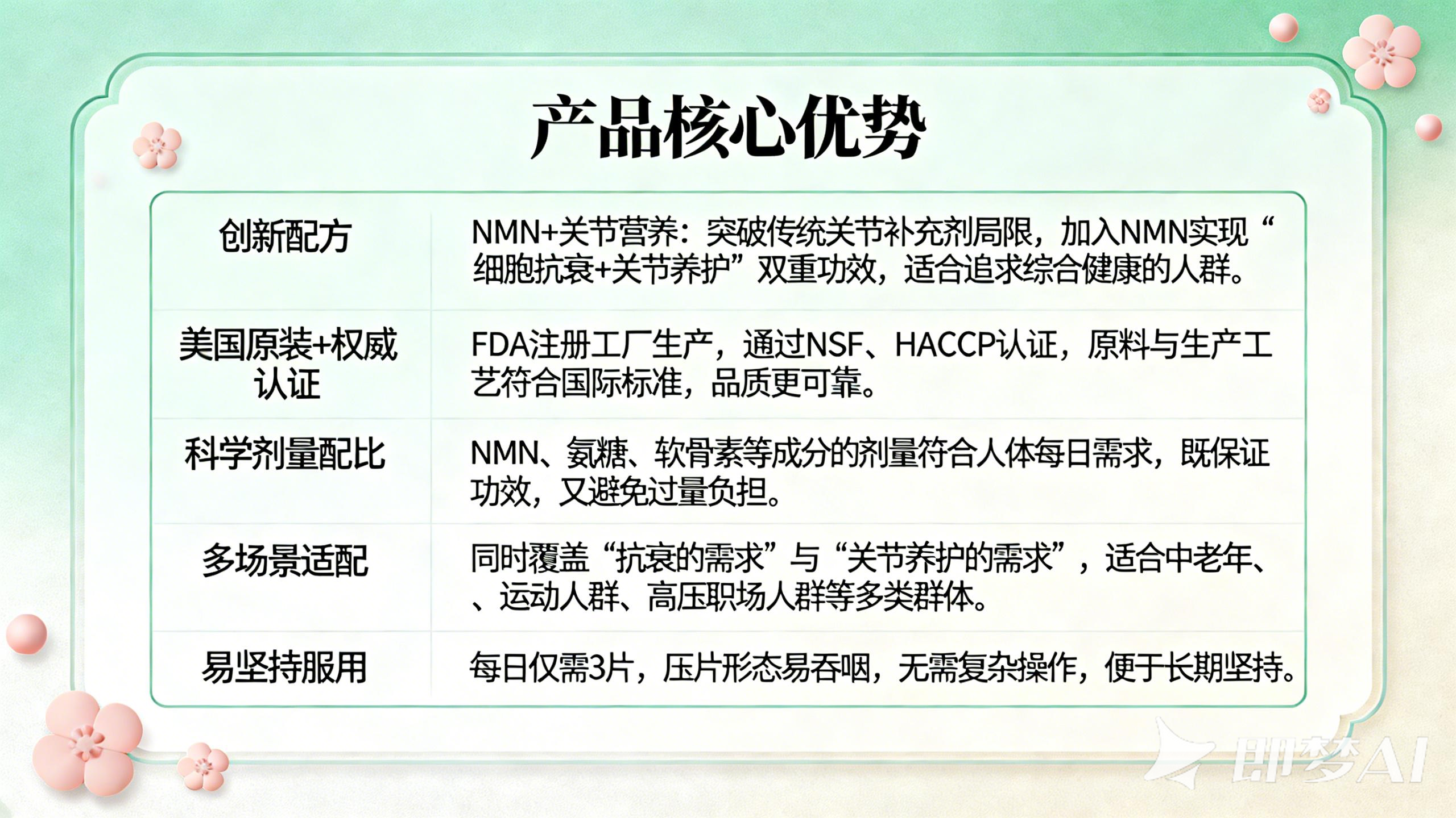 1. Dual-Effect Anti-Aging: Cells + Joints: NMN revitalizes cells and slows down the decline of bodily functions; glucosamine and chondroitin nourish joints and delay joint aging.
