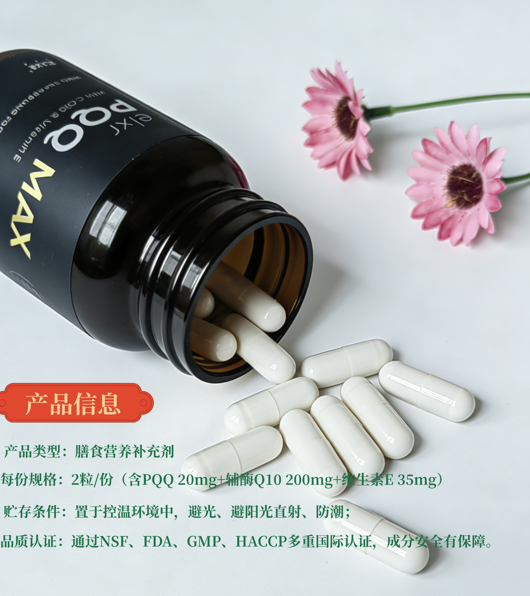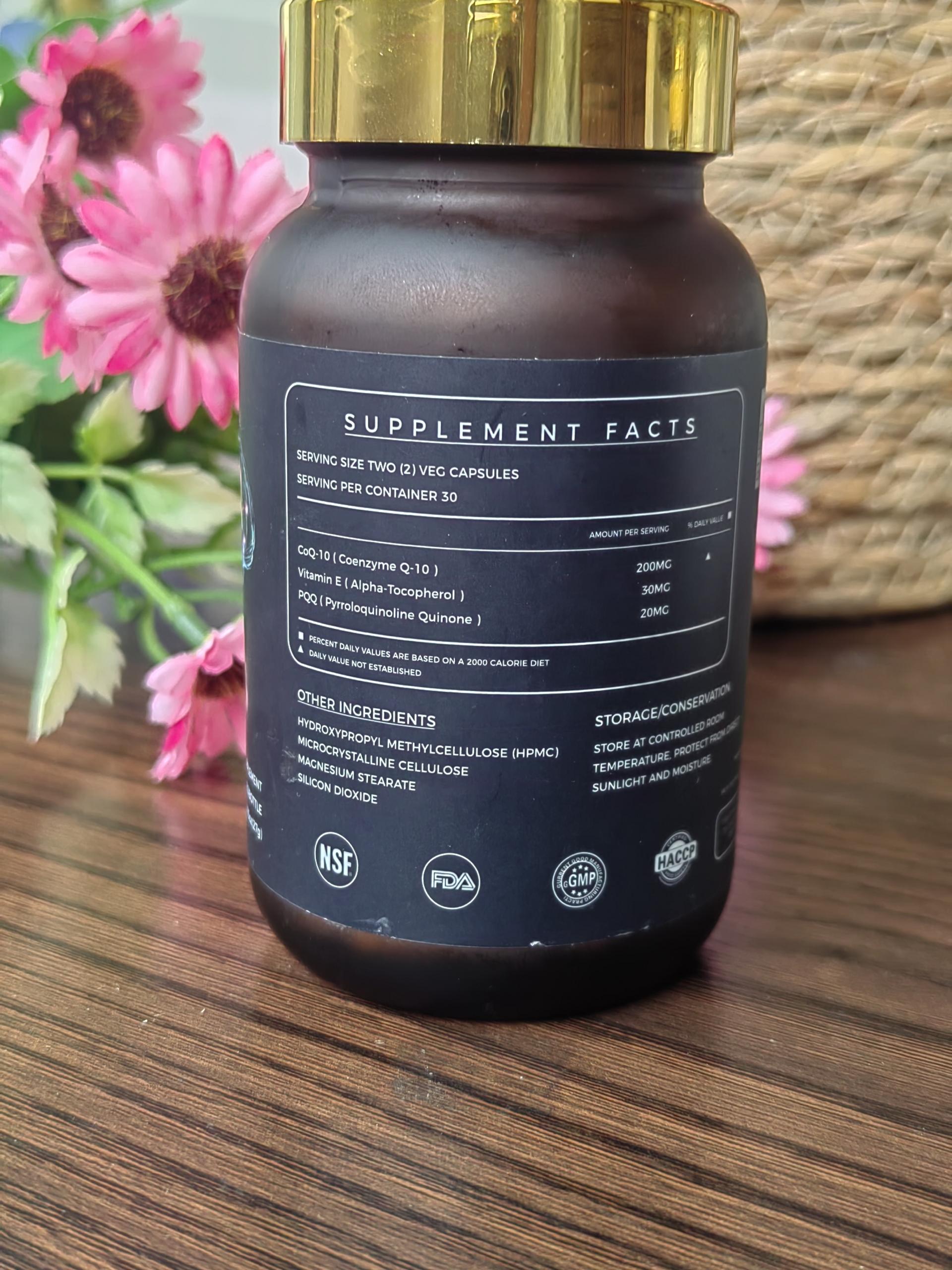 – Serving Size: 2 capsules/serving (Contains PQQ 20mg + Coenzyme Q10 200mg + Vitamin E 35mg)